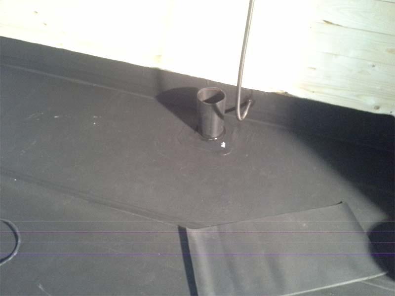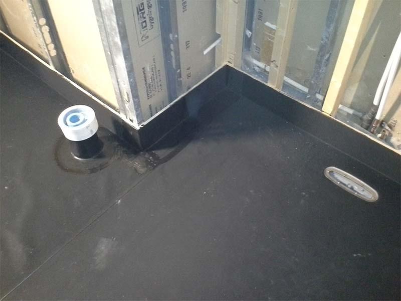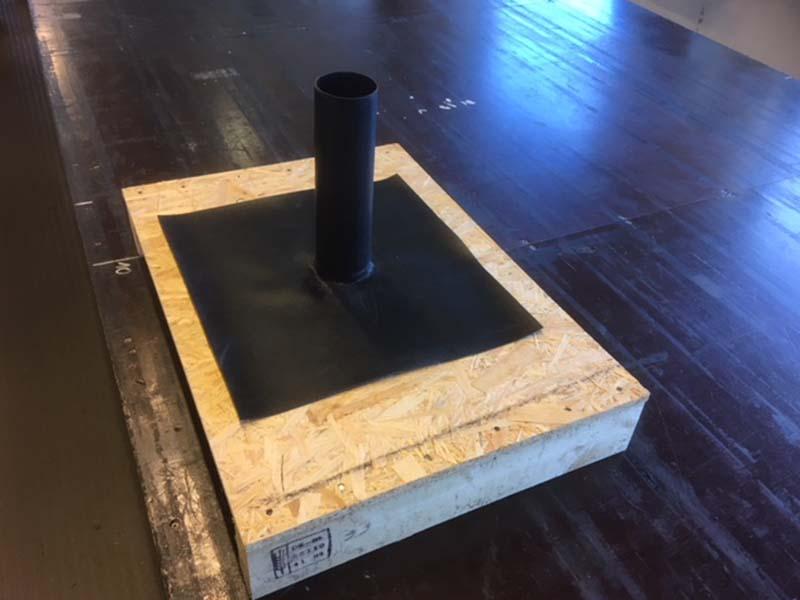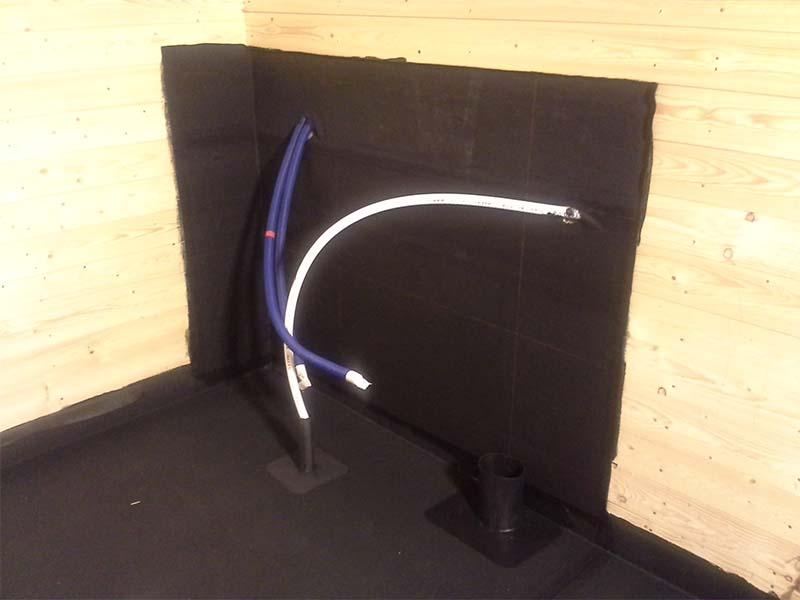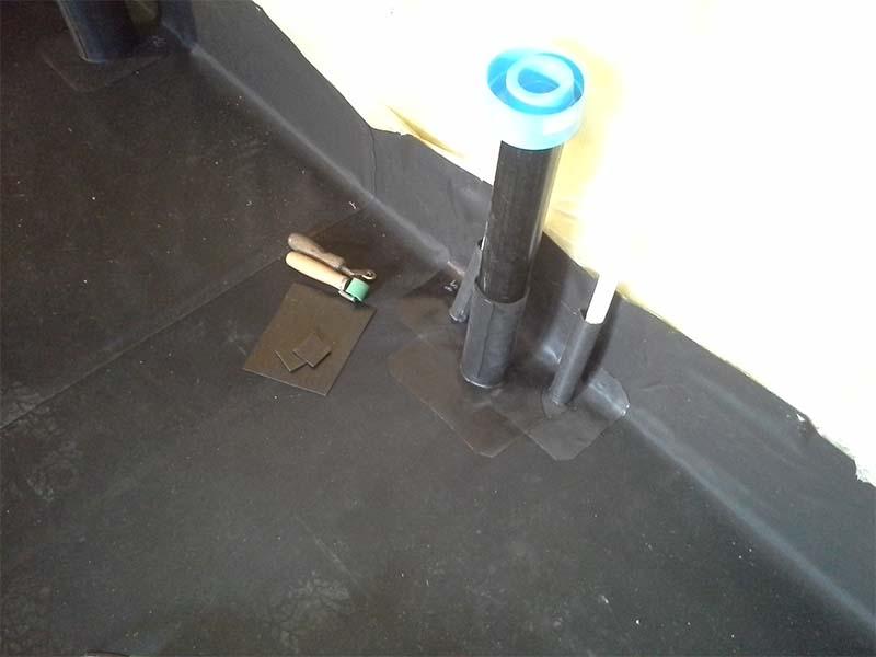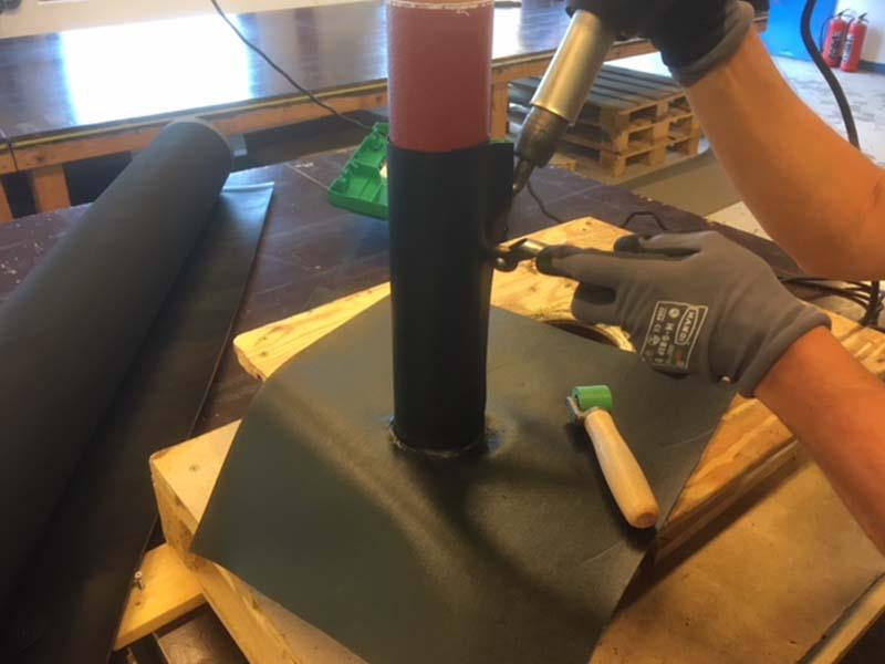 Der hvor det skal gå rør gjennom membranen er det veldig viktig at det er en sikker og tett løsning for dette! Vi prefabrikkerer rørgjennomføringene våre selv på vårt verksted. Rørgjennomføringen blir laget av Elastoseal FLR gummi, som er et materiale som har et sveise belegg på den ene siden. Disse kan lages i de aller fleste dimensjoner. Når vi skal ut å legge for eksempel membran på et bad, tar vi med ferdig lagde rørgjennomføringer, som vi varmluftsveiser fast til membranen på byggeplassen.