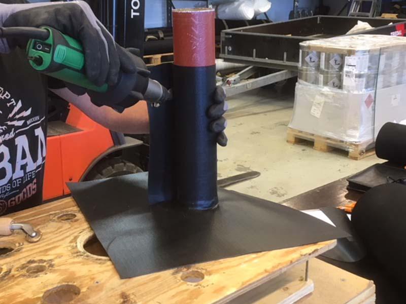 Når vi prefabrikkerer membran for levering eller sending, har vi muligheten til å varmluft sveise rørgjennomføringen ferdig til membran, hvis vi får nøyaktige mål på dimensjon og på rørplasseringen.